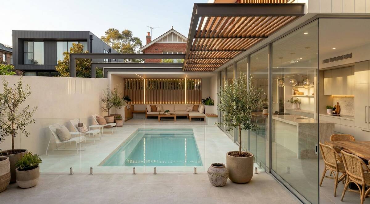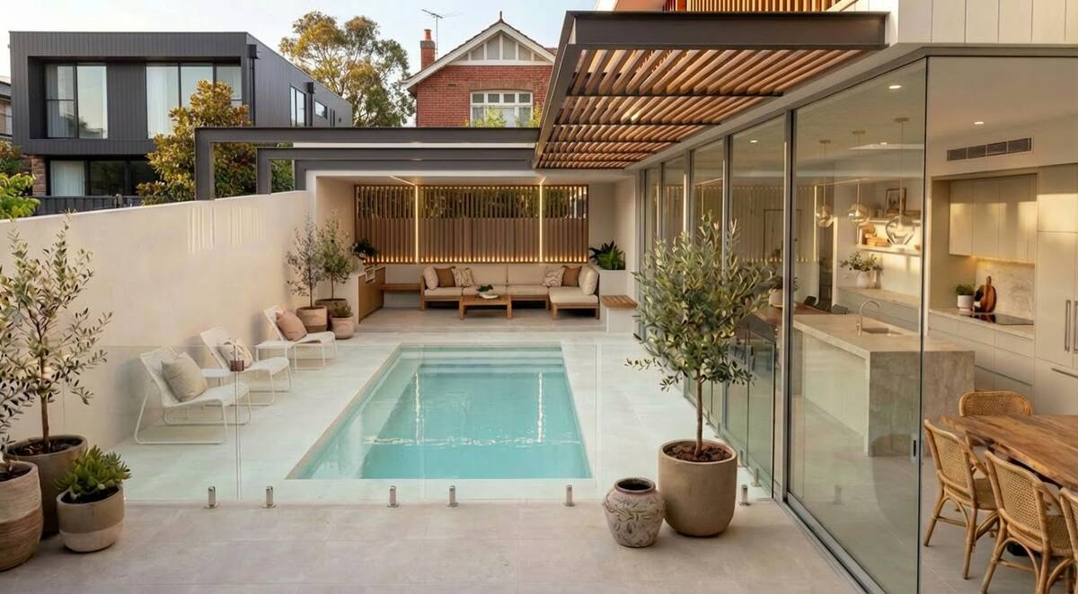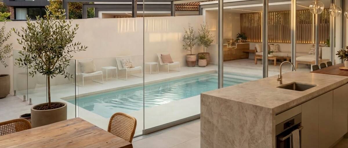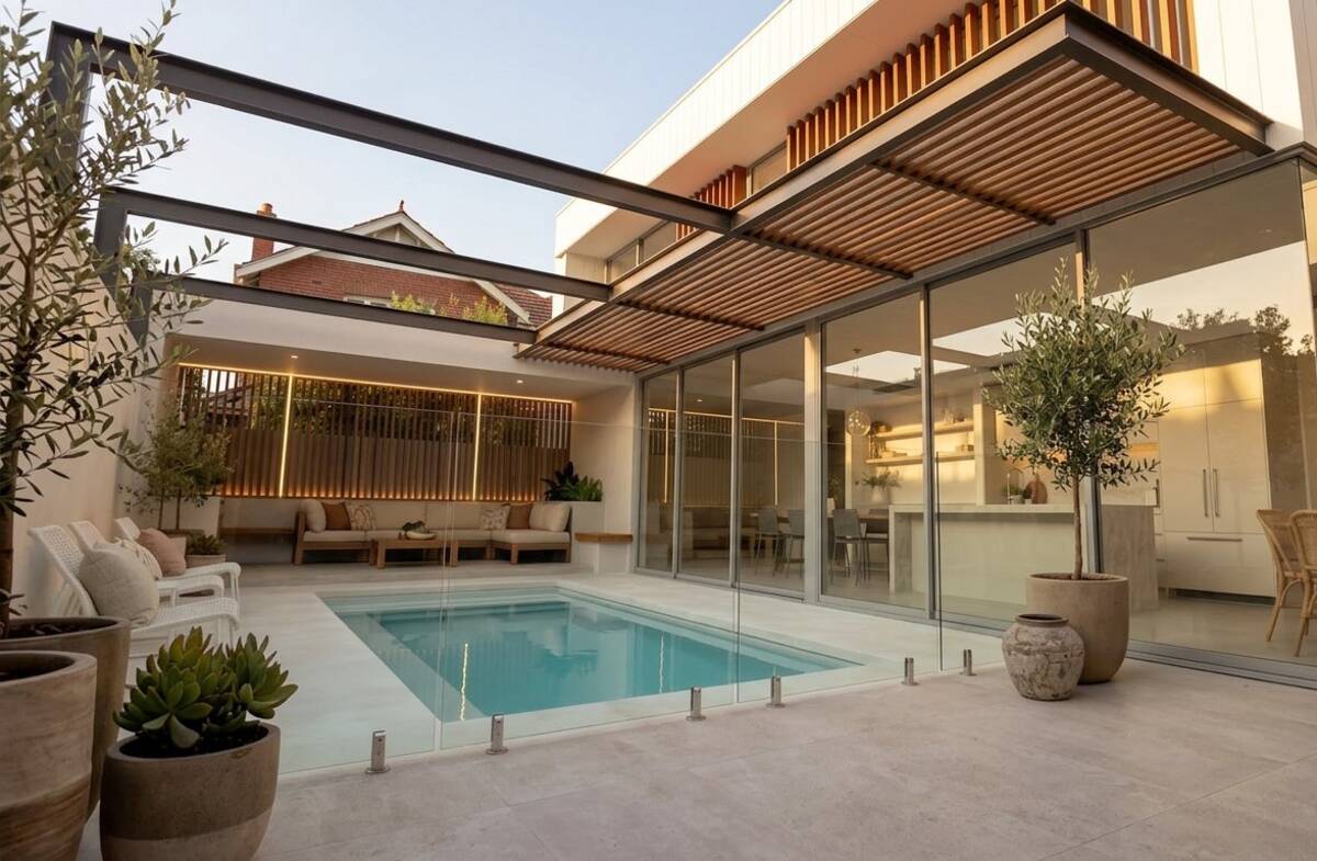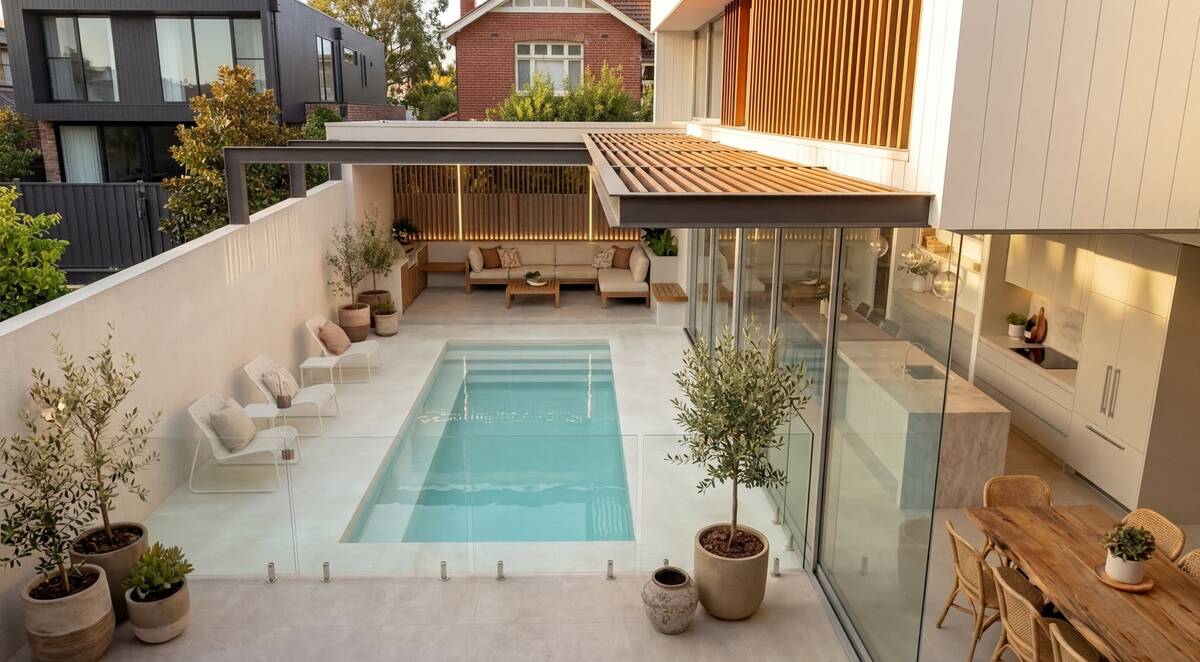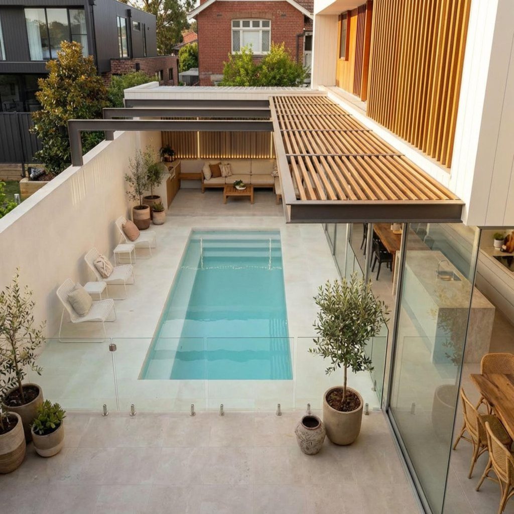 A grand entry stairway that doubles as generous seating without intruding on the swim area.