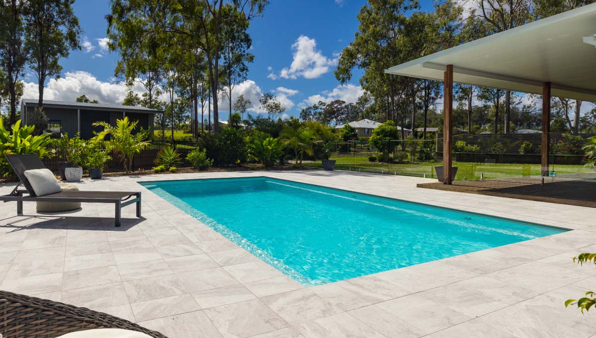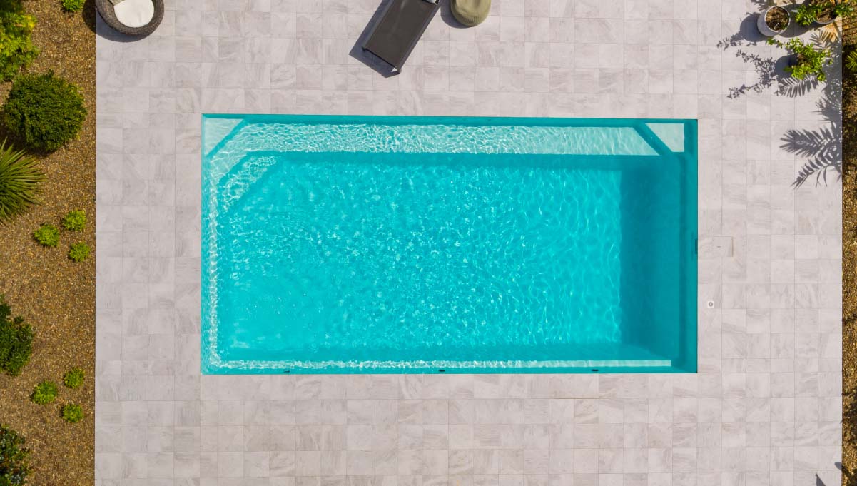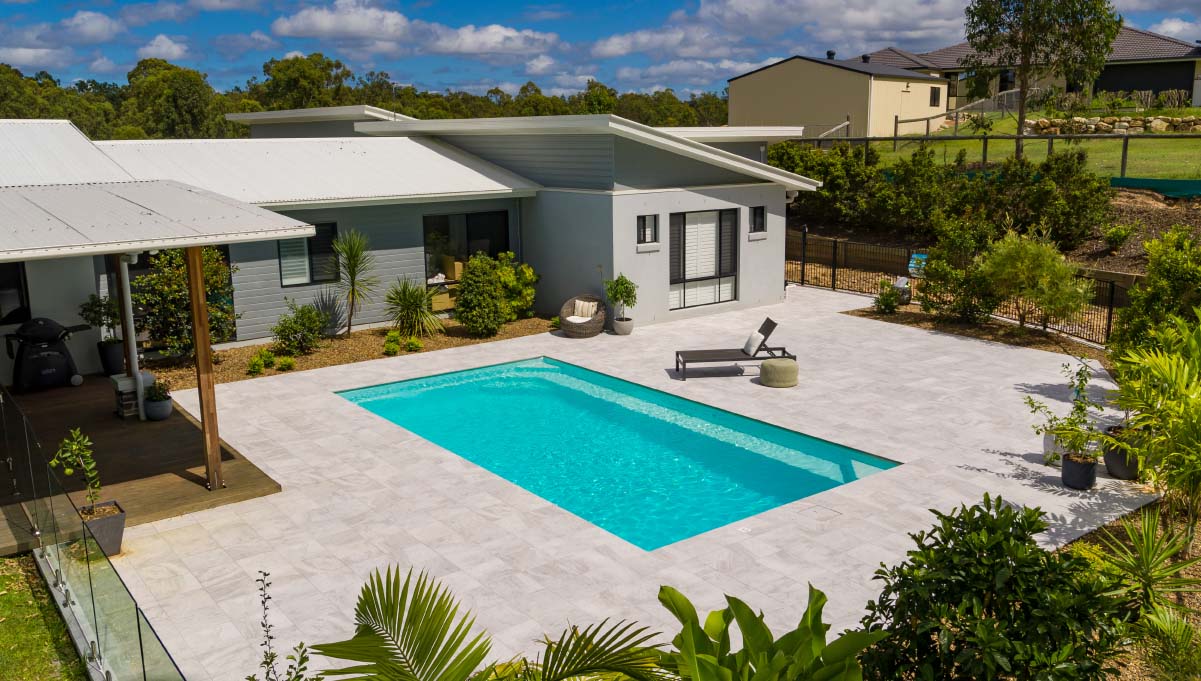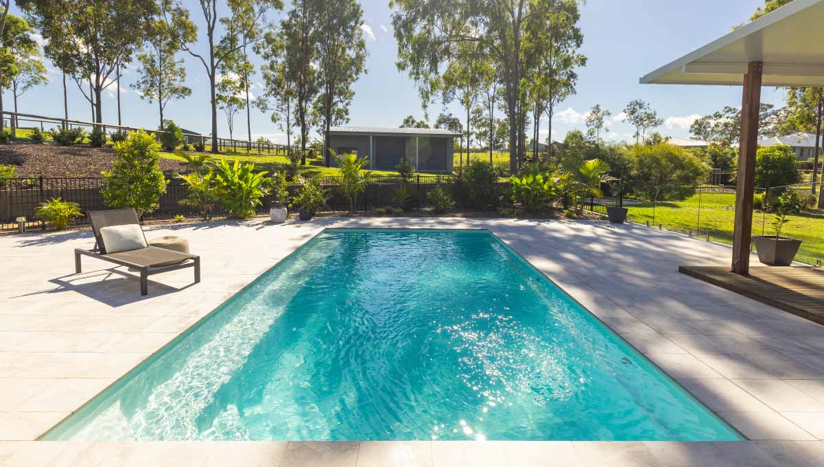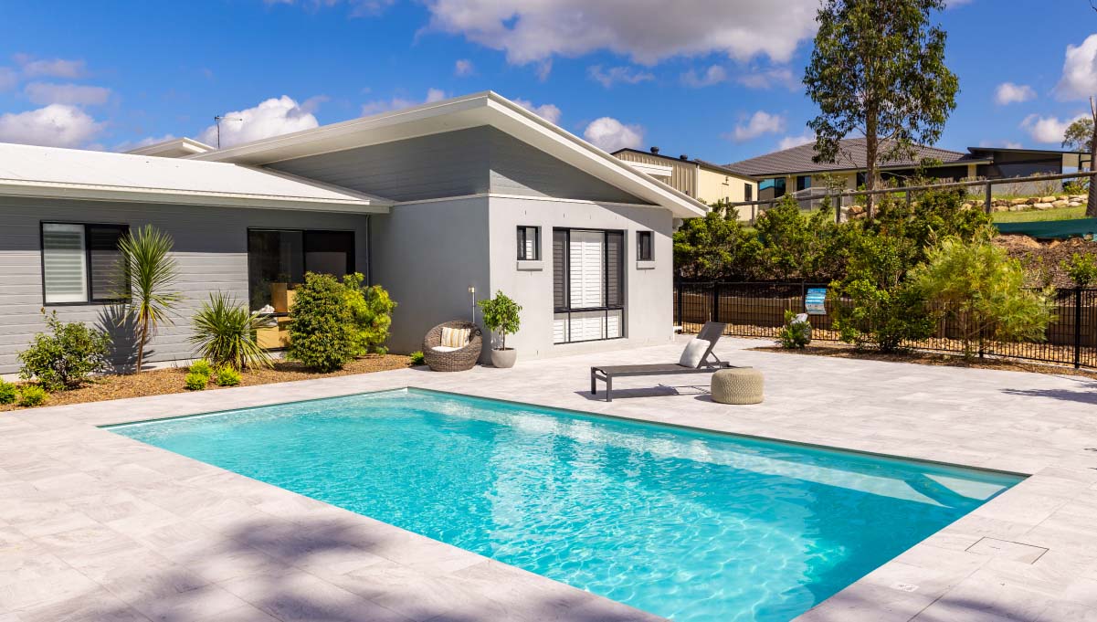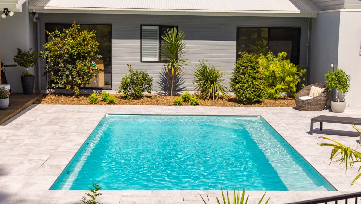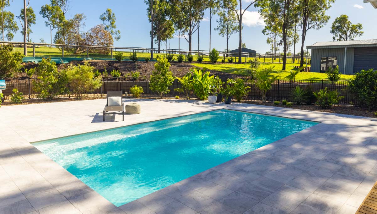 The Brampton pool in our 10.2m configuration is sporting our Alpine White Shimmer colour. For modern homes, this colour can offer a complementary or contrasting look, depending on your backyard landscape and aesthetic. This pool offers a great range of swimming space and there’s room to kick back and relax on the full length bench seat. Contact our team today for more information!