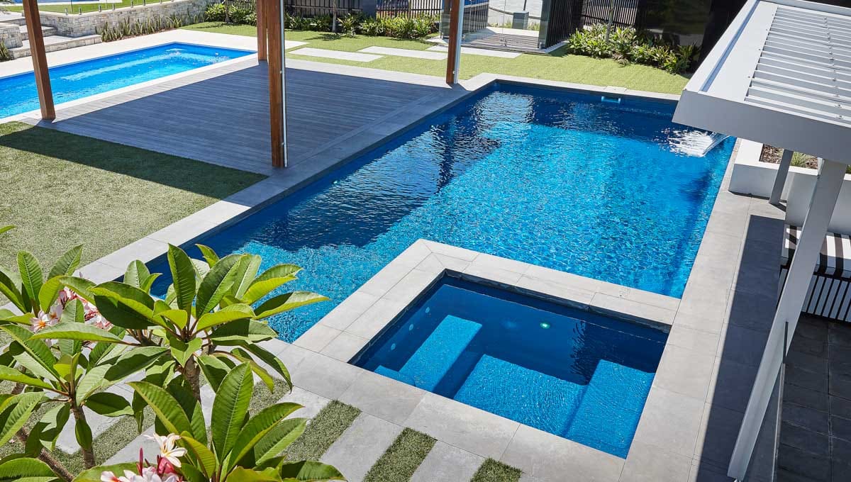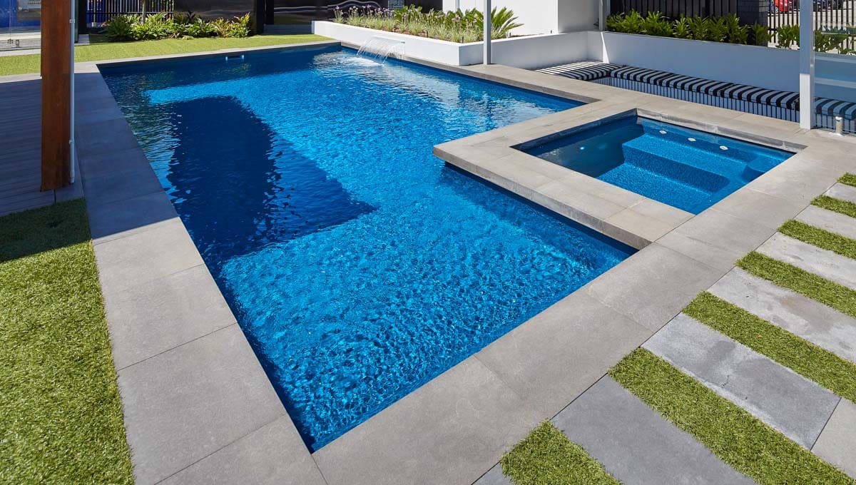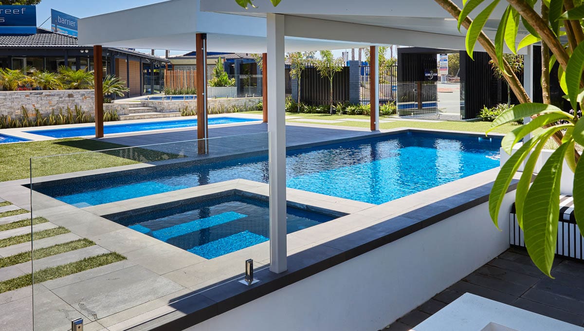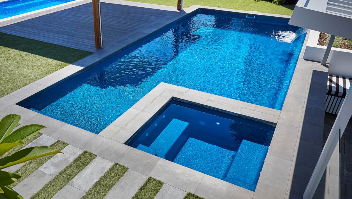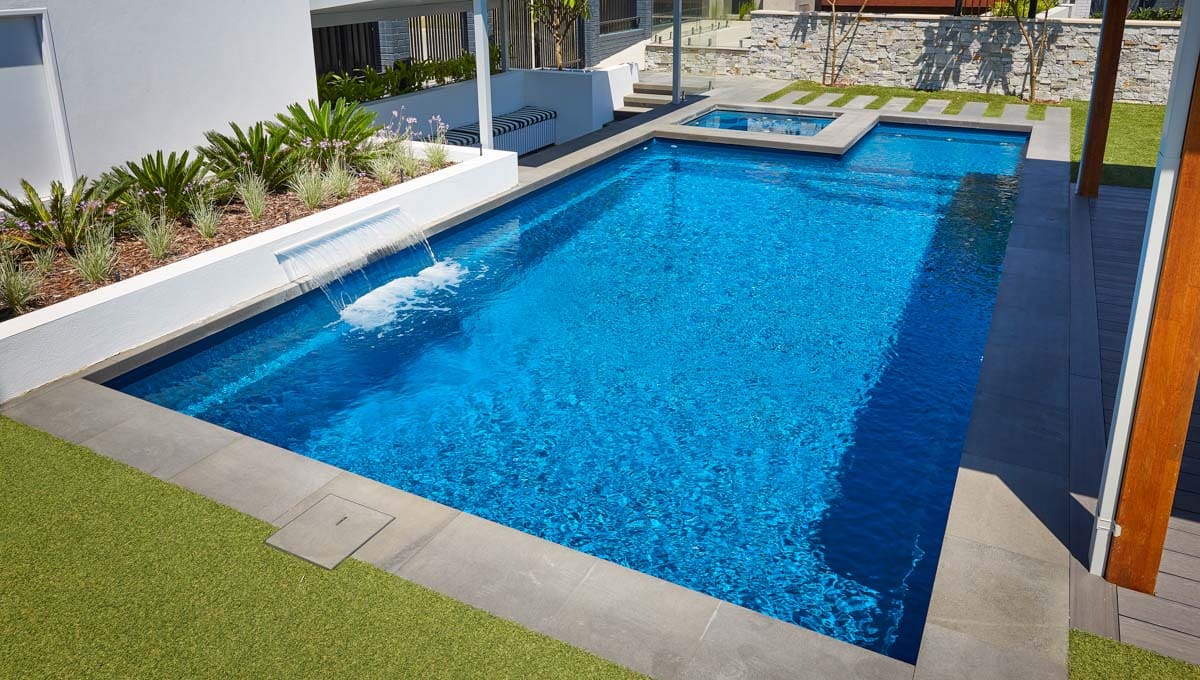 View our gallery of our 9.6m x 4.4m Manhattan in our Royal Jade Shimmer colour. This fibreglass pool was installed at our O’Connor Display Centre.