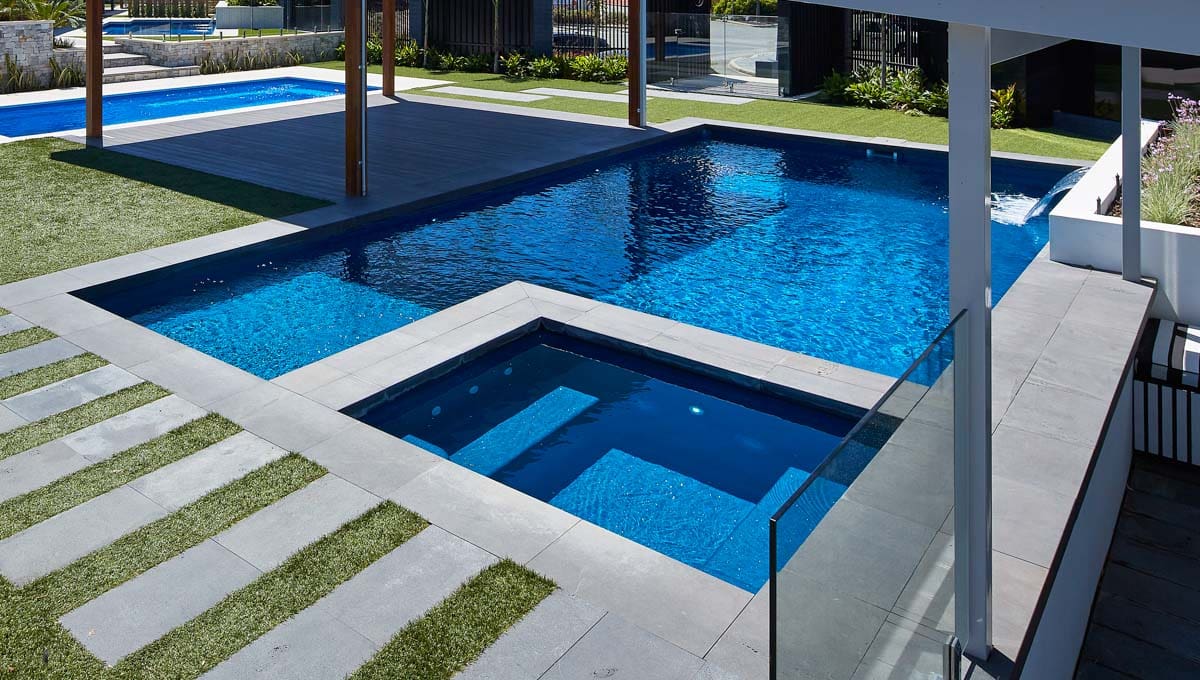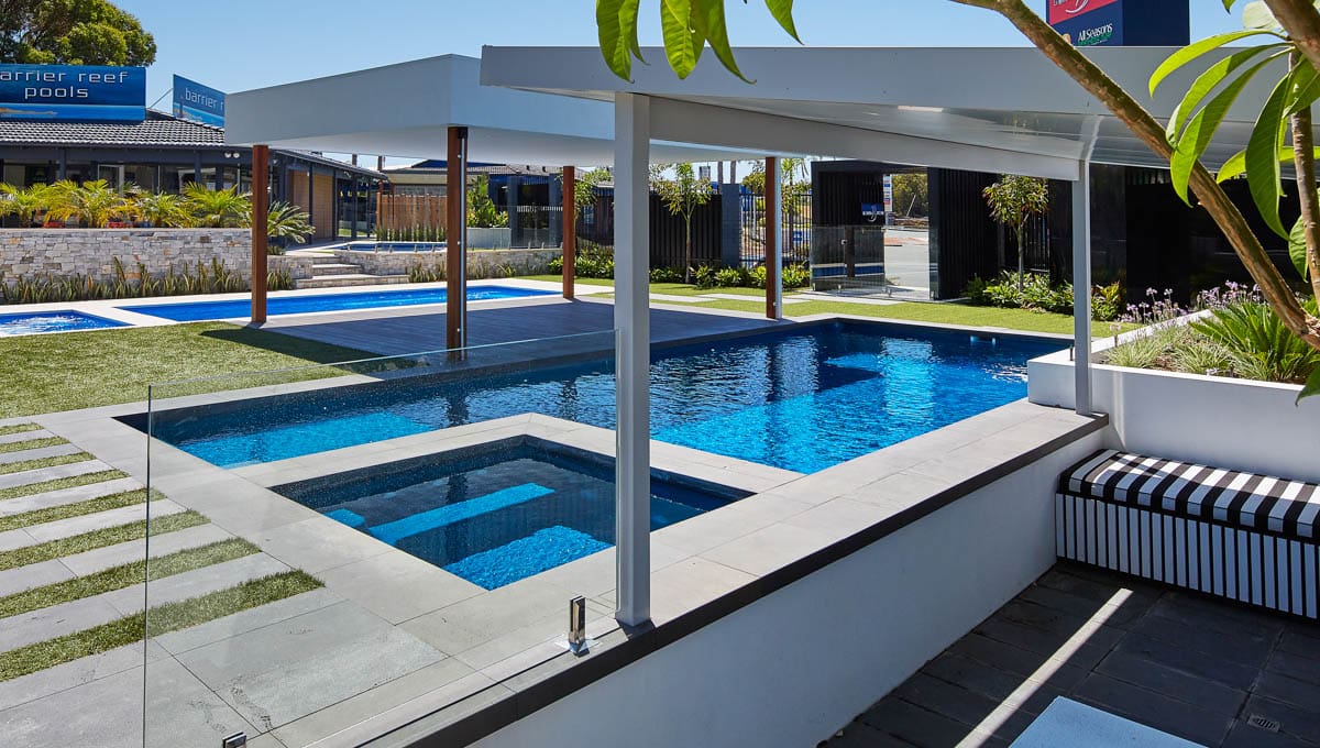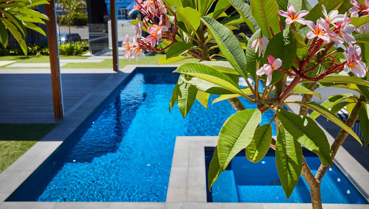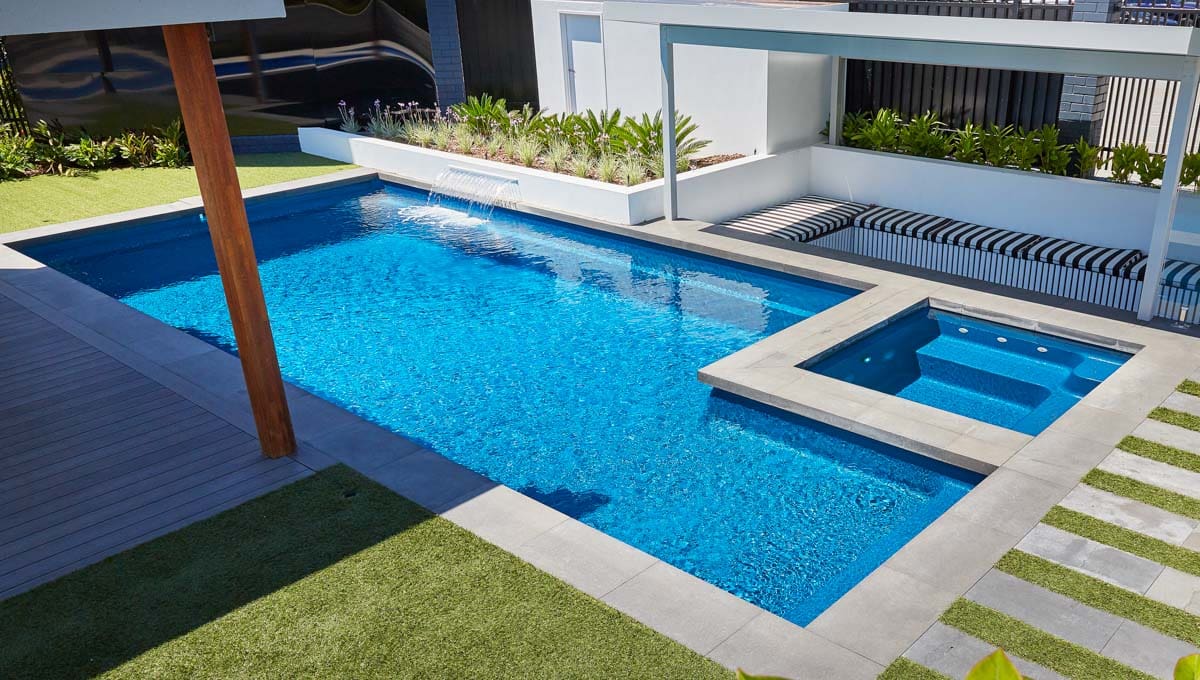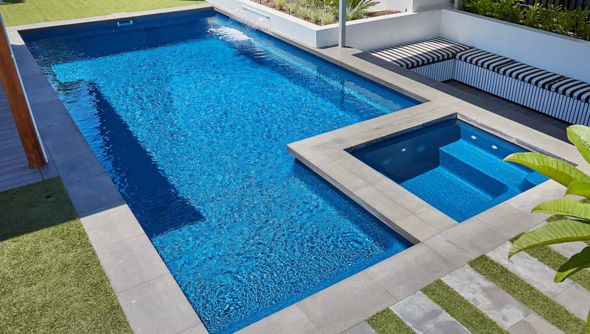 View our gallery of our 9.6m x 4.4m Manhattan in our Royal Jade Shimmer colour. This fibreglass pool was installed at our O’Connor Display Centre.