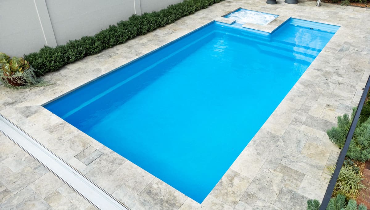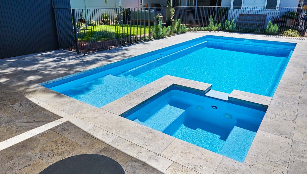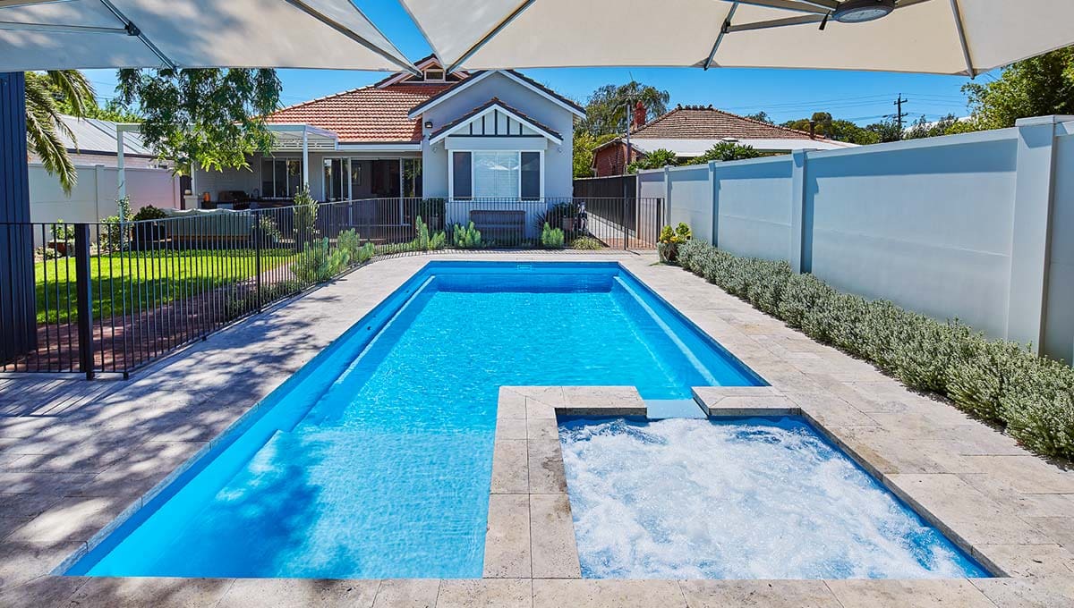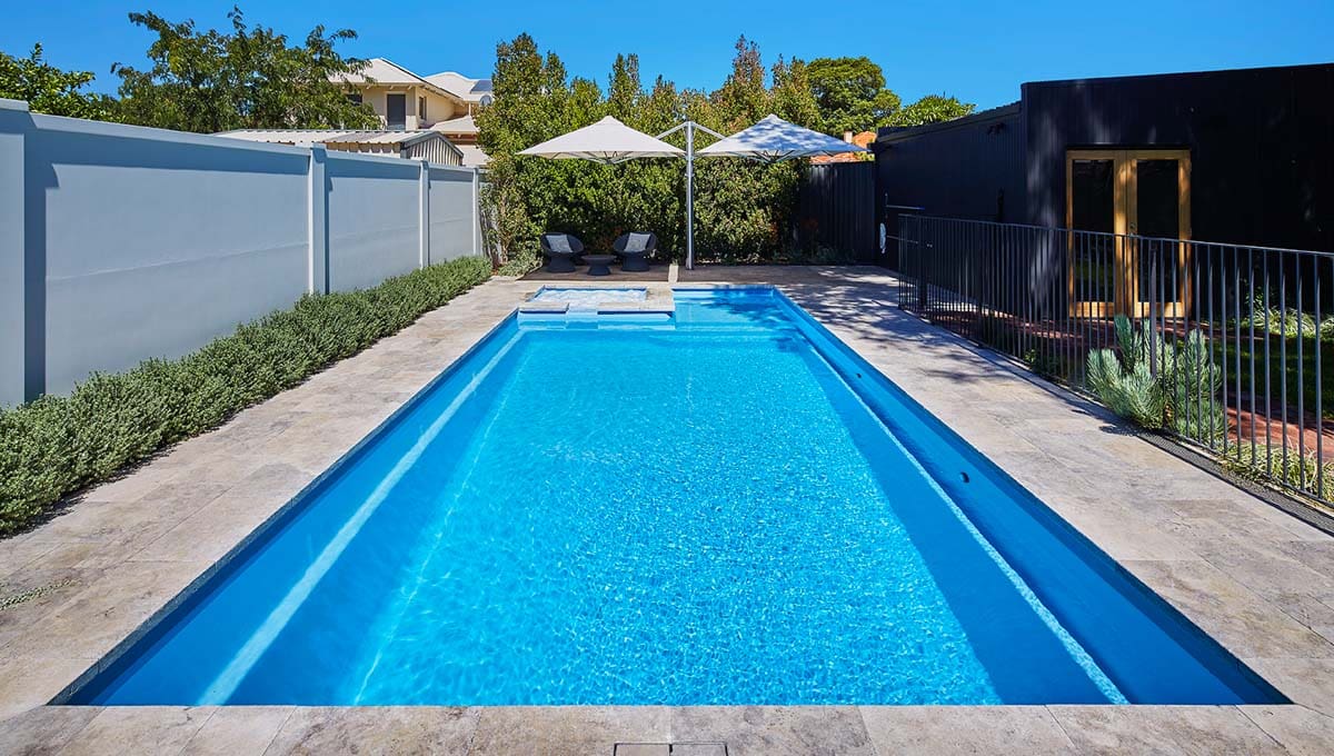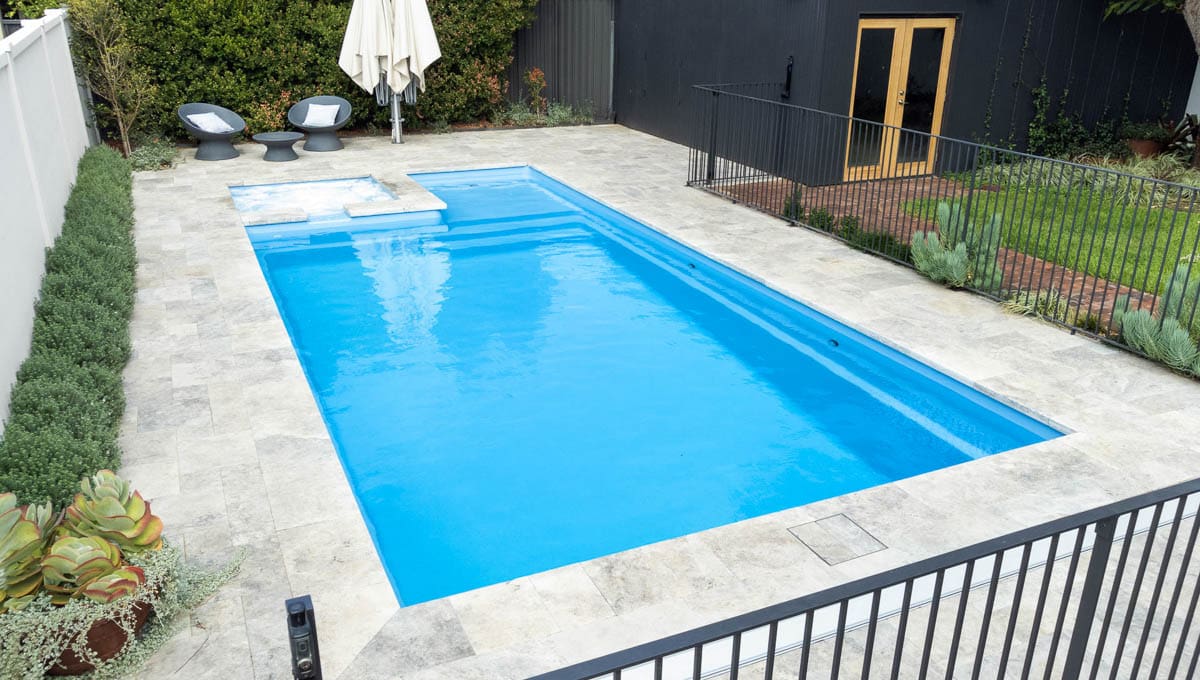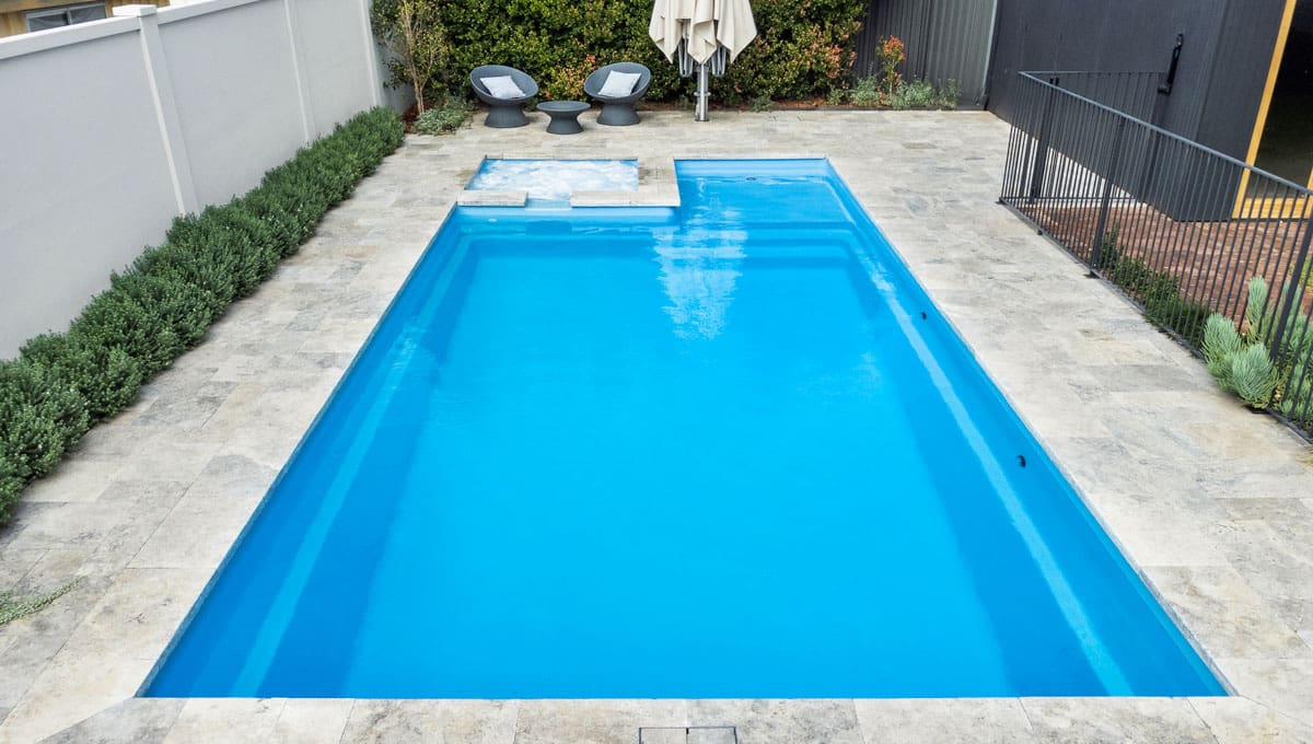 View our gallery of our 9.6m x 4.4m Manhattan in our Sky Blue Shimmer colour. This fibreglass pool was installed at Inglewood.
