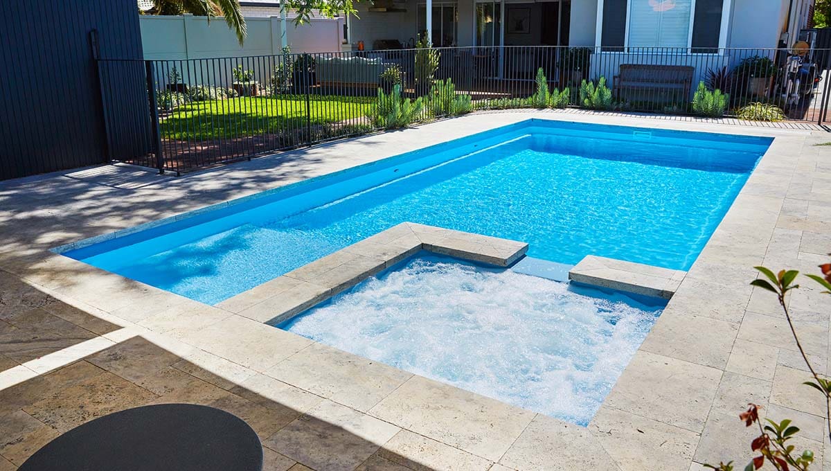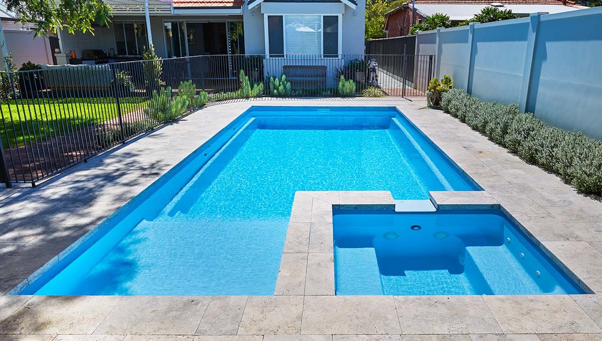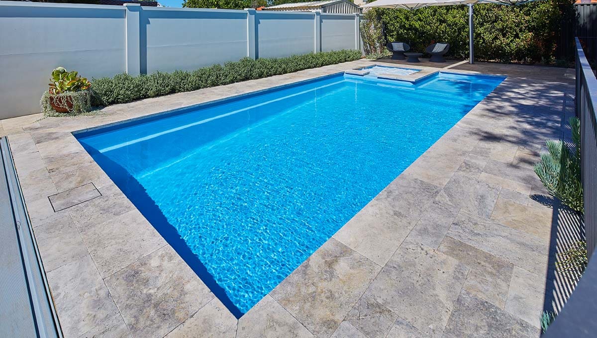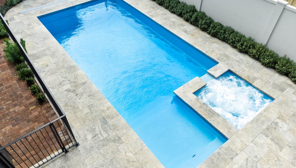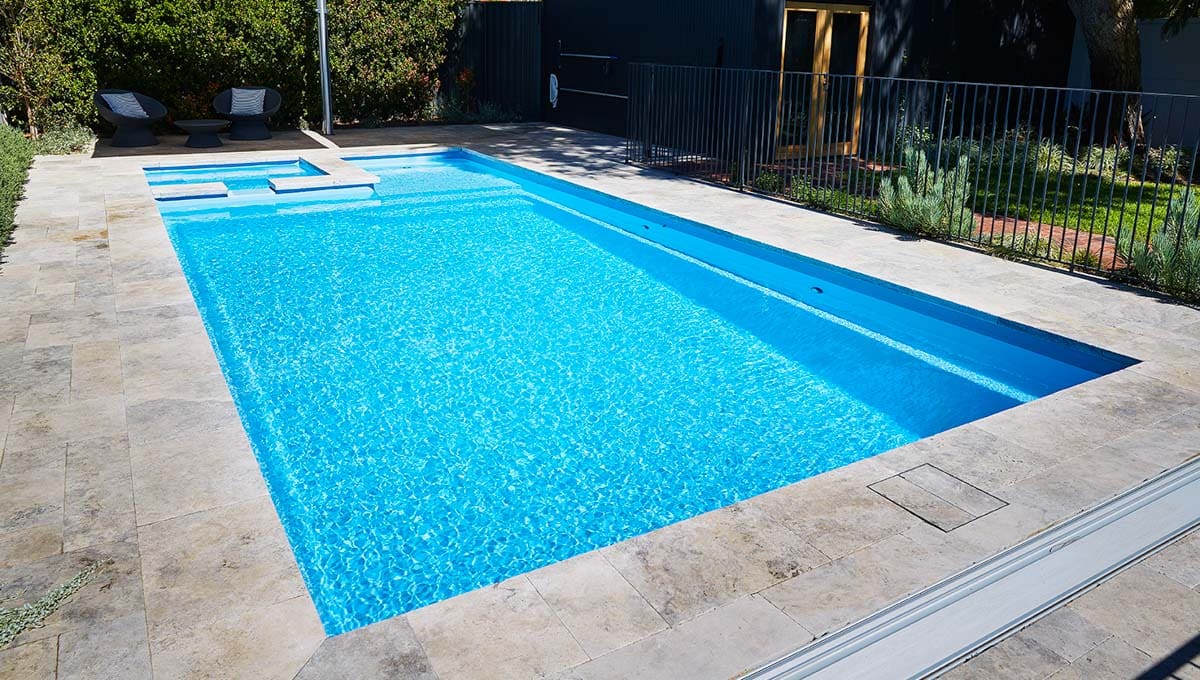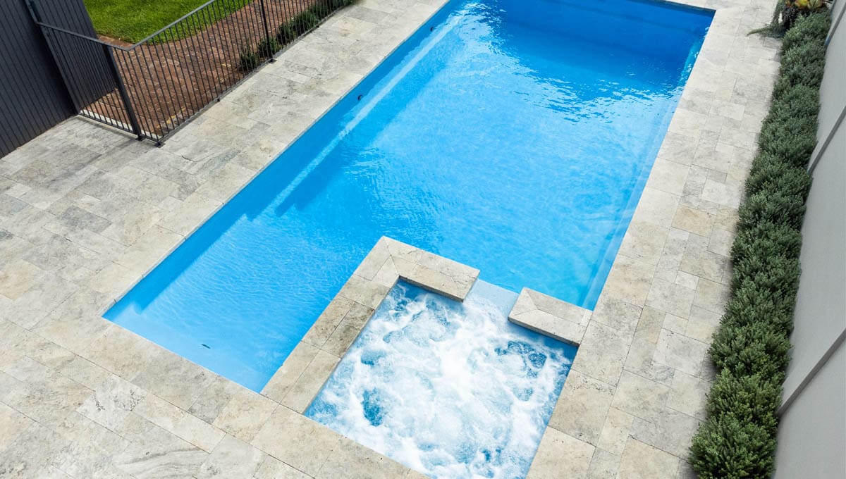 View our gallery of our 9.6m x 4.4m Manhattan in our Sky Blue Shimmer colour. This fibreglass pool was installed at Inglewood.