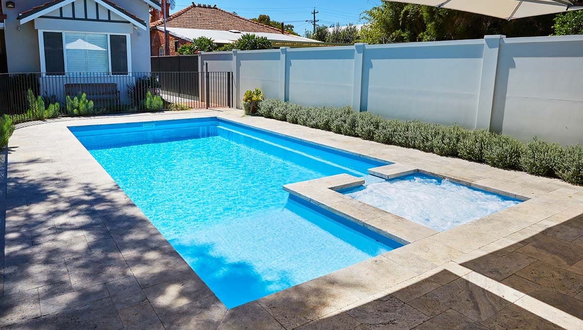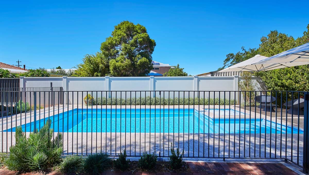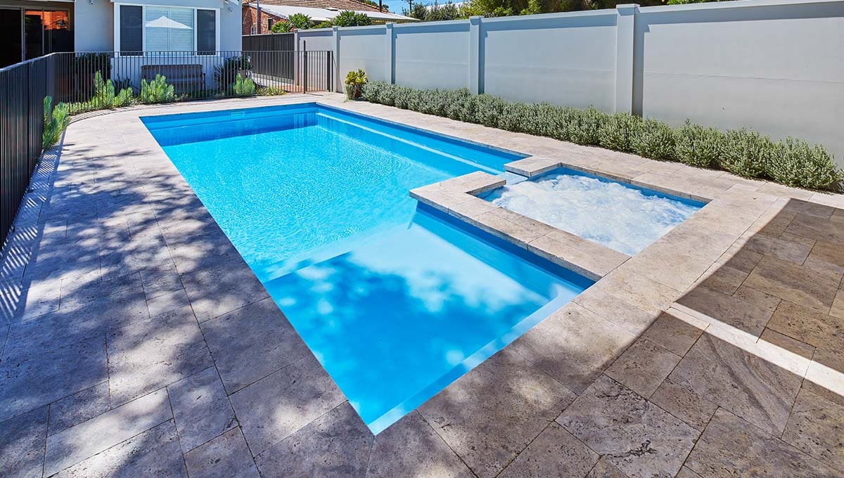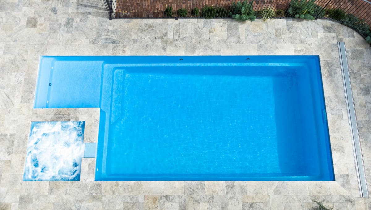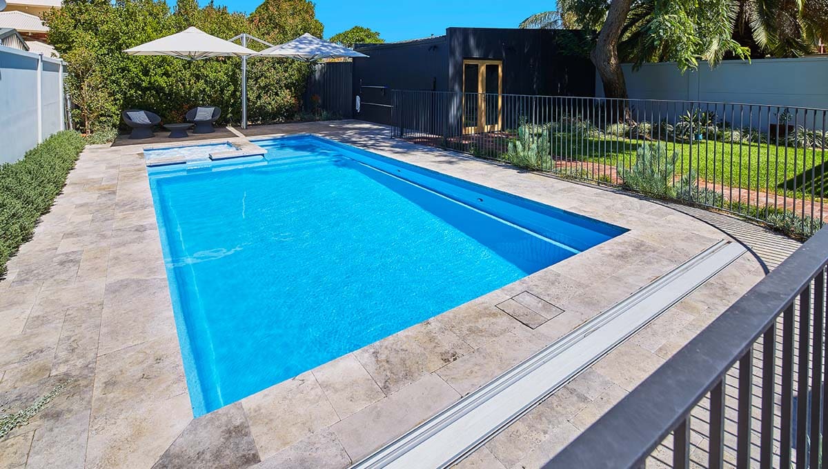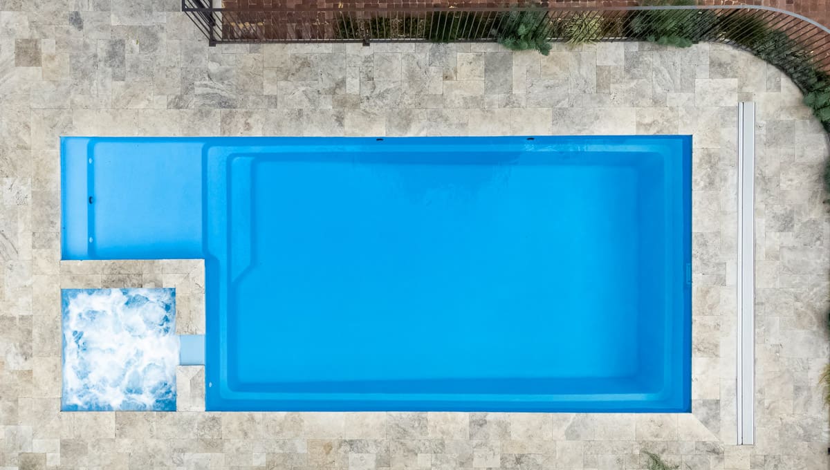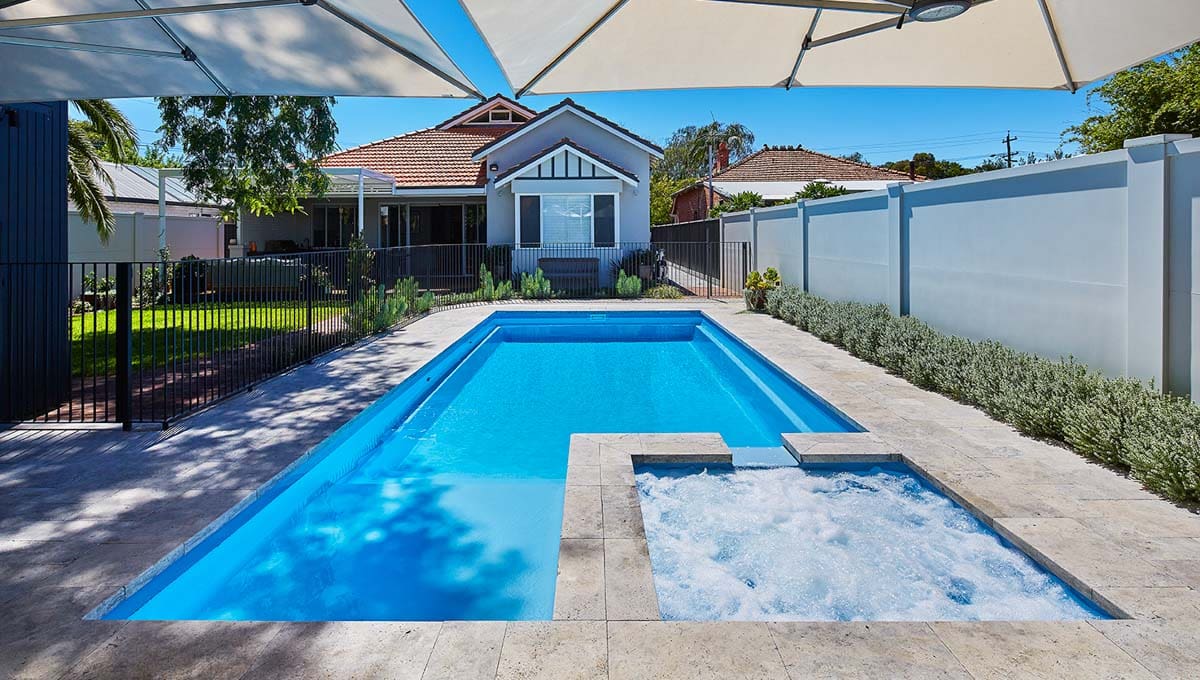 View our gallery of our 9.6m x 4.4m Manhattan in our Sky Blue Shimmer colour. This fibreglass pool was installed at Inglewood.