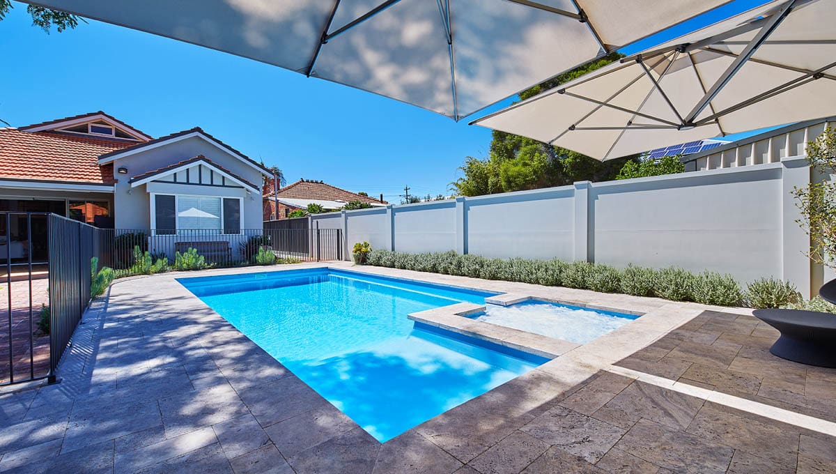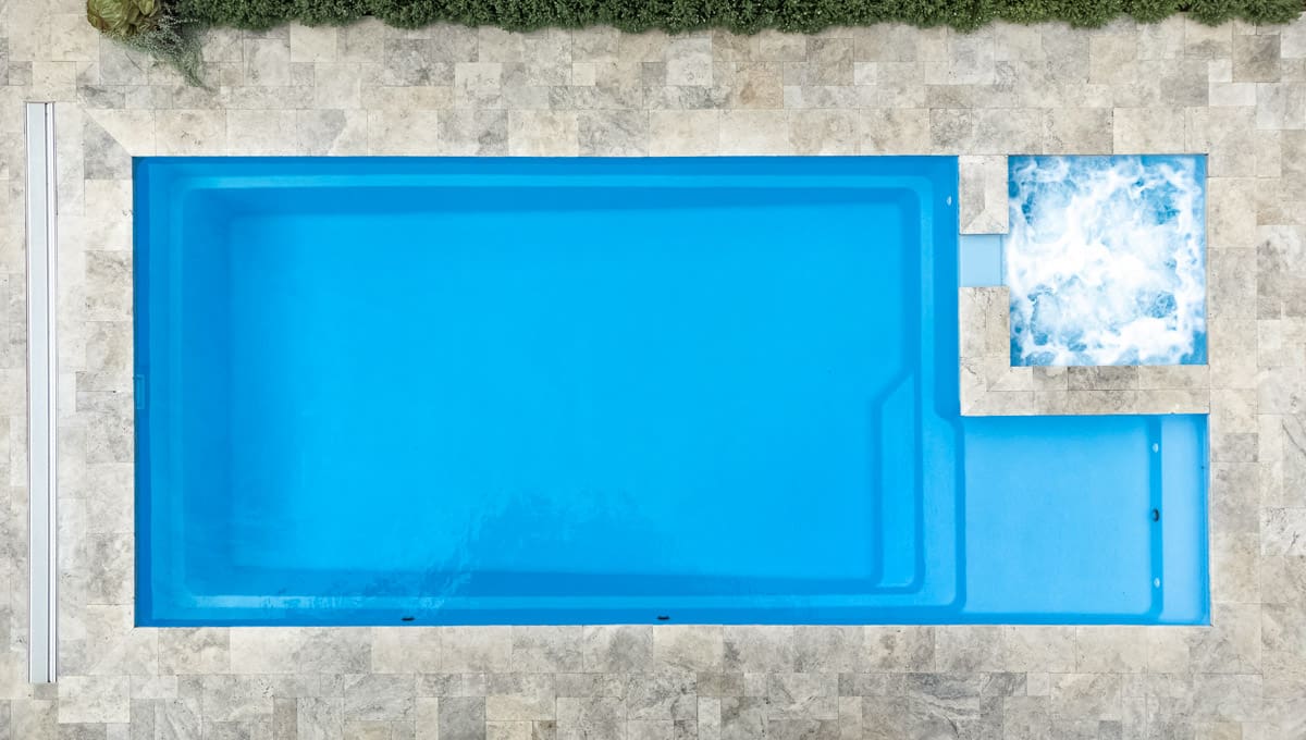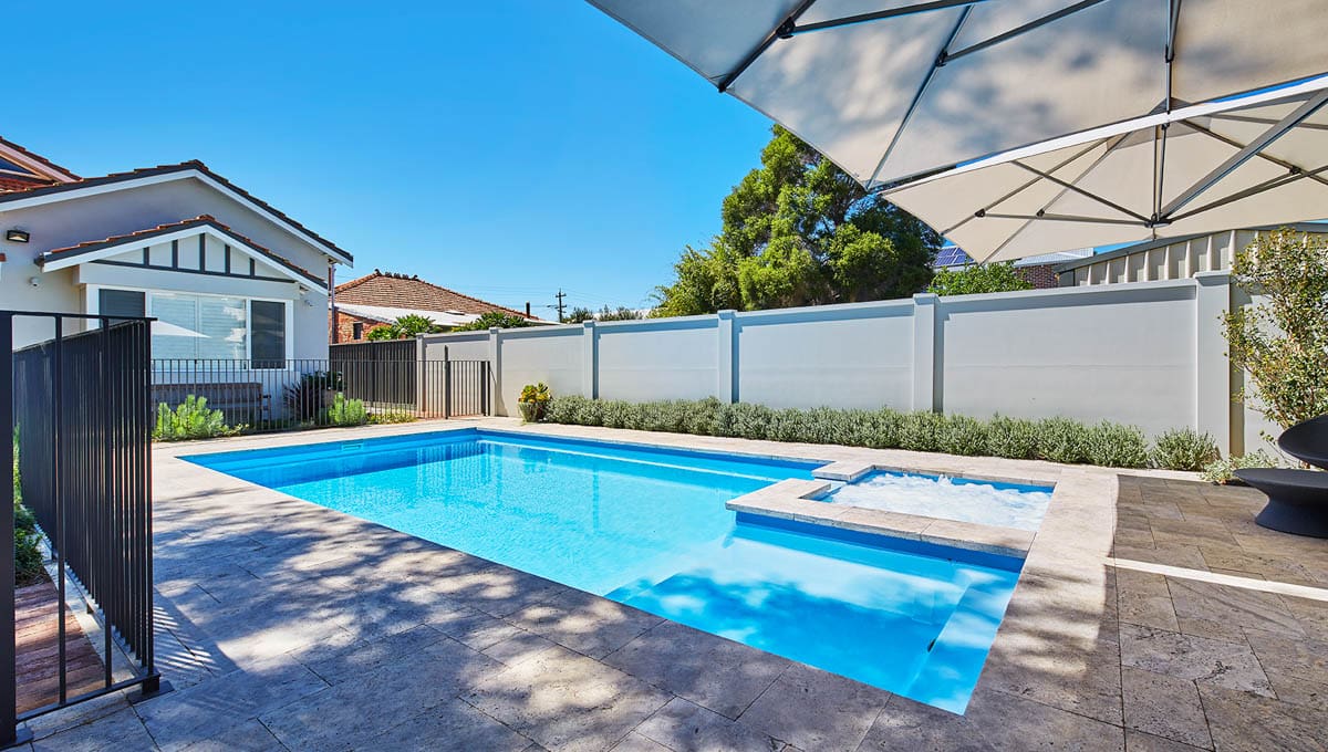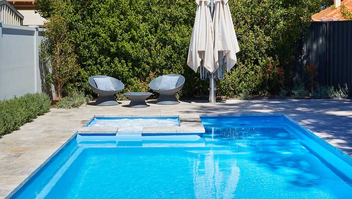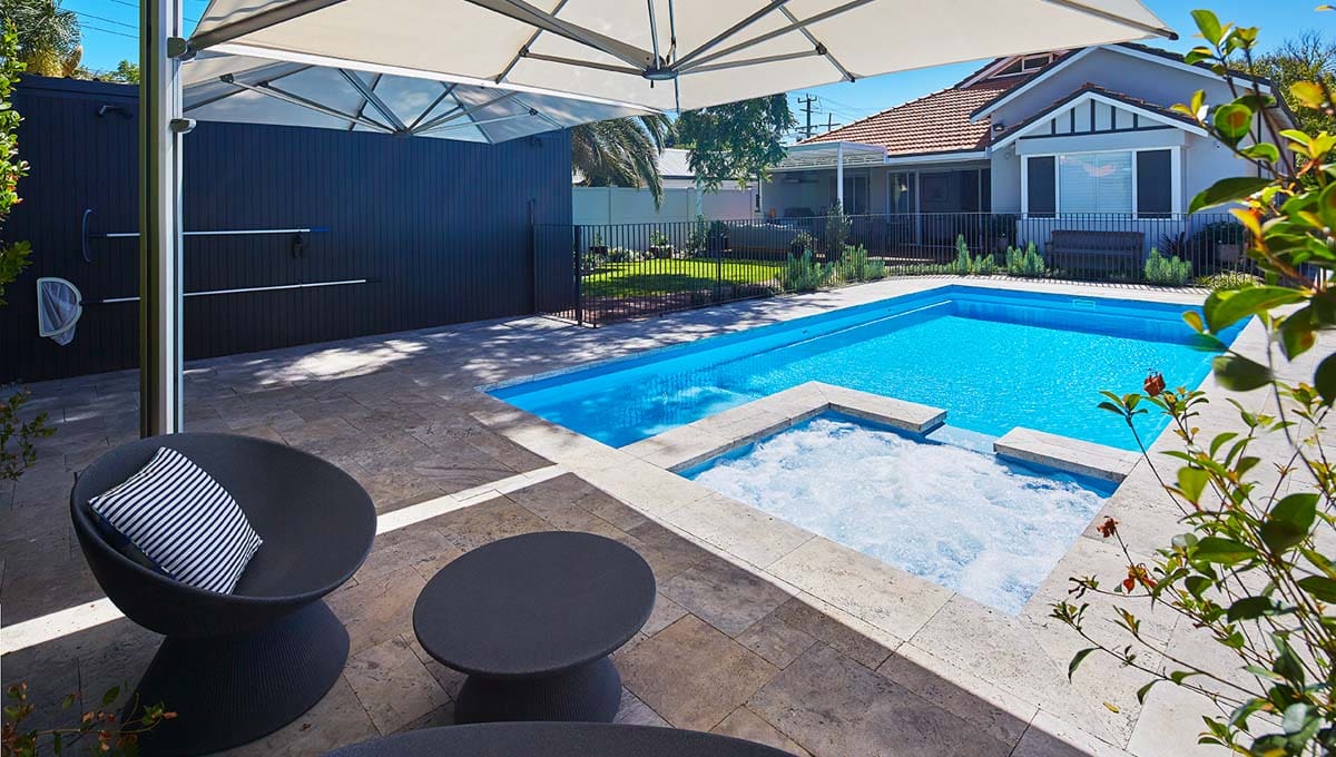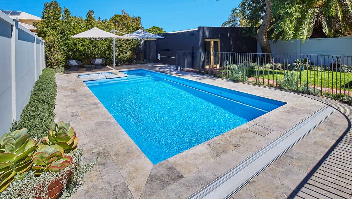 View our gallery of our 9.6m x 4.4m Manhattan in our Sky Blue Shimmer colour. This fibreglass pool was installed at Inglewood.