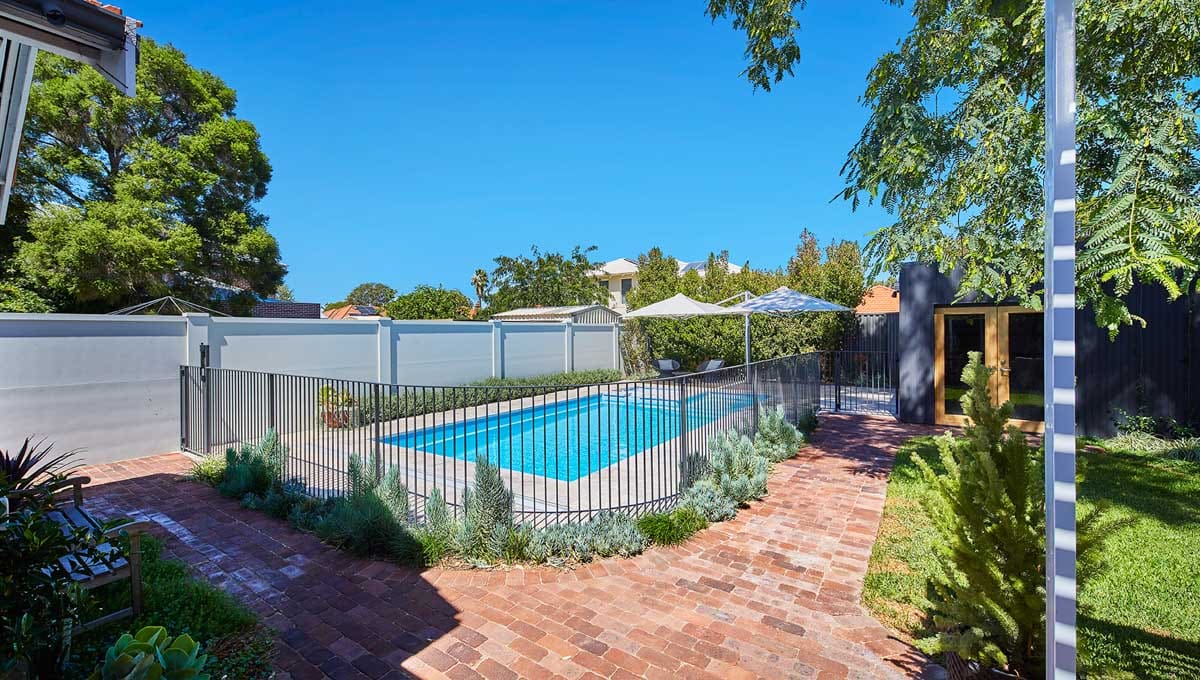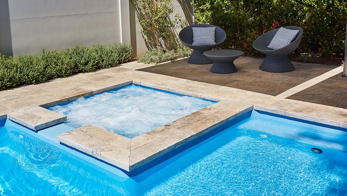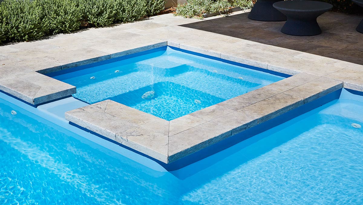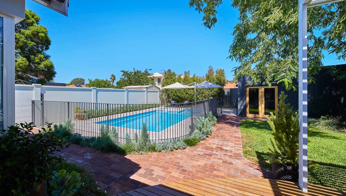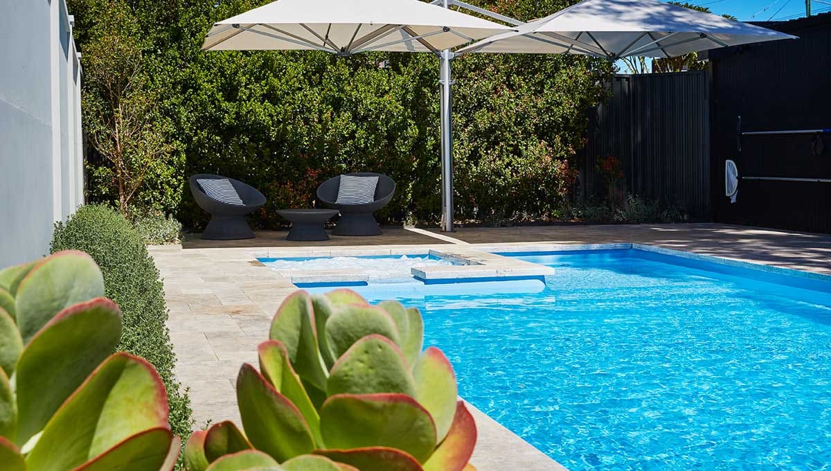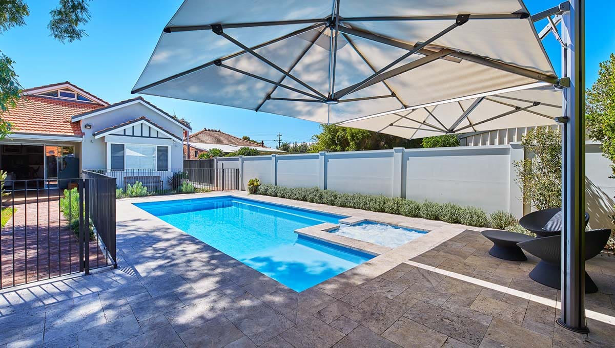 View our gallery of our 9.6m x 4.4m Manhattan in our Sky Blue Shimmer colour. This fibreglass pool was installed at Inglewood.