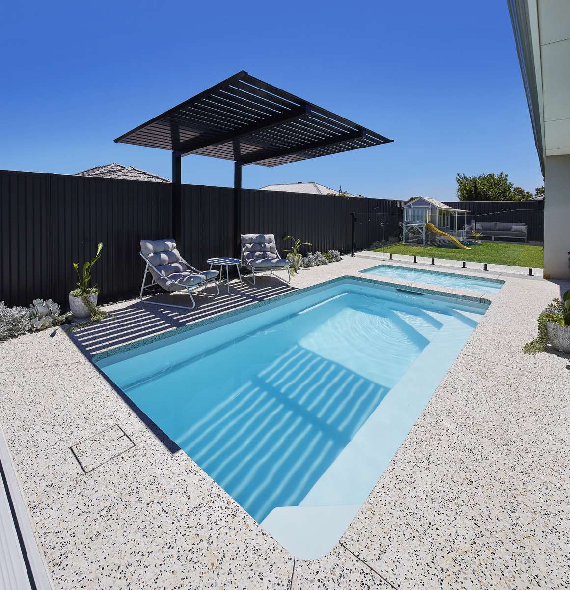 This impressive one‑piece pool design has been thoughtfully created to suit families of all sizes. As you enter, the steps lead down onto a practical full‑length bench, offering plenty of space for seating as well as a dedicated play zone for children.