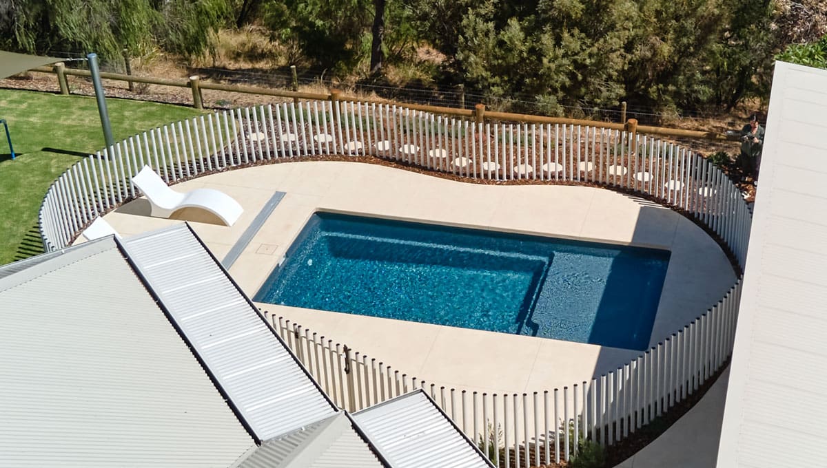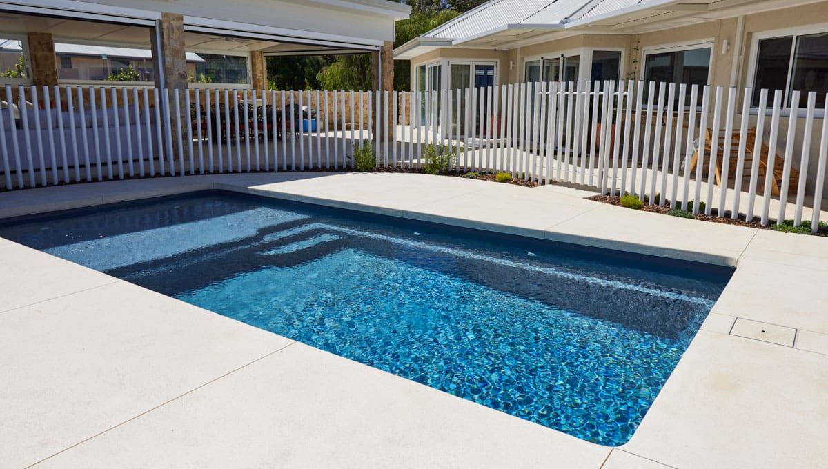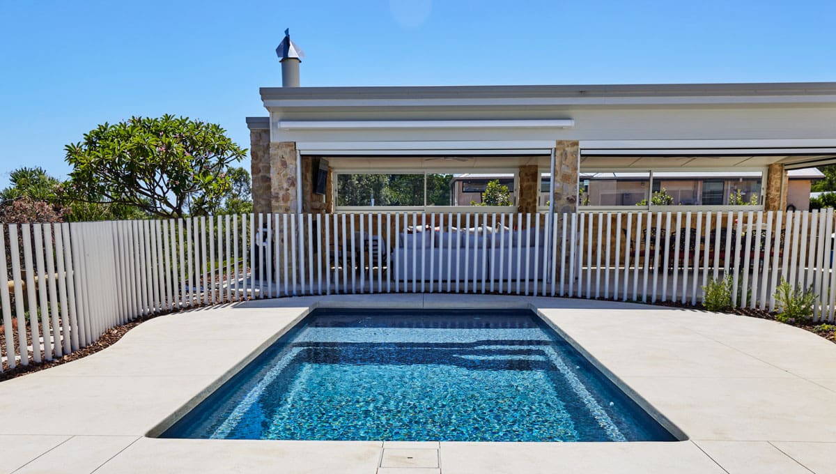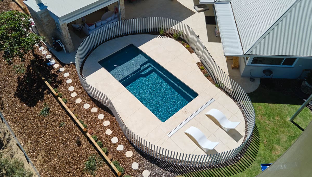Our Sunseeker Slimline has been installed in Grosemont in our fantastic Midnight Shimmer colour! The perfect pool for lounging around and enjoying the sun, this pool offers it all. This installation has used a contemporary style fence, with numerous poles strategically placed close together to create a stunning fencing design.