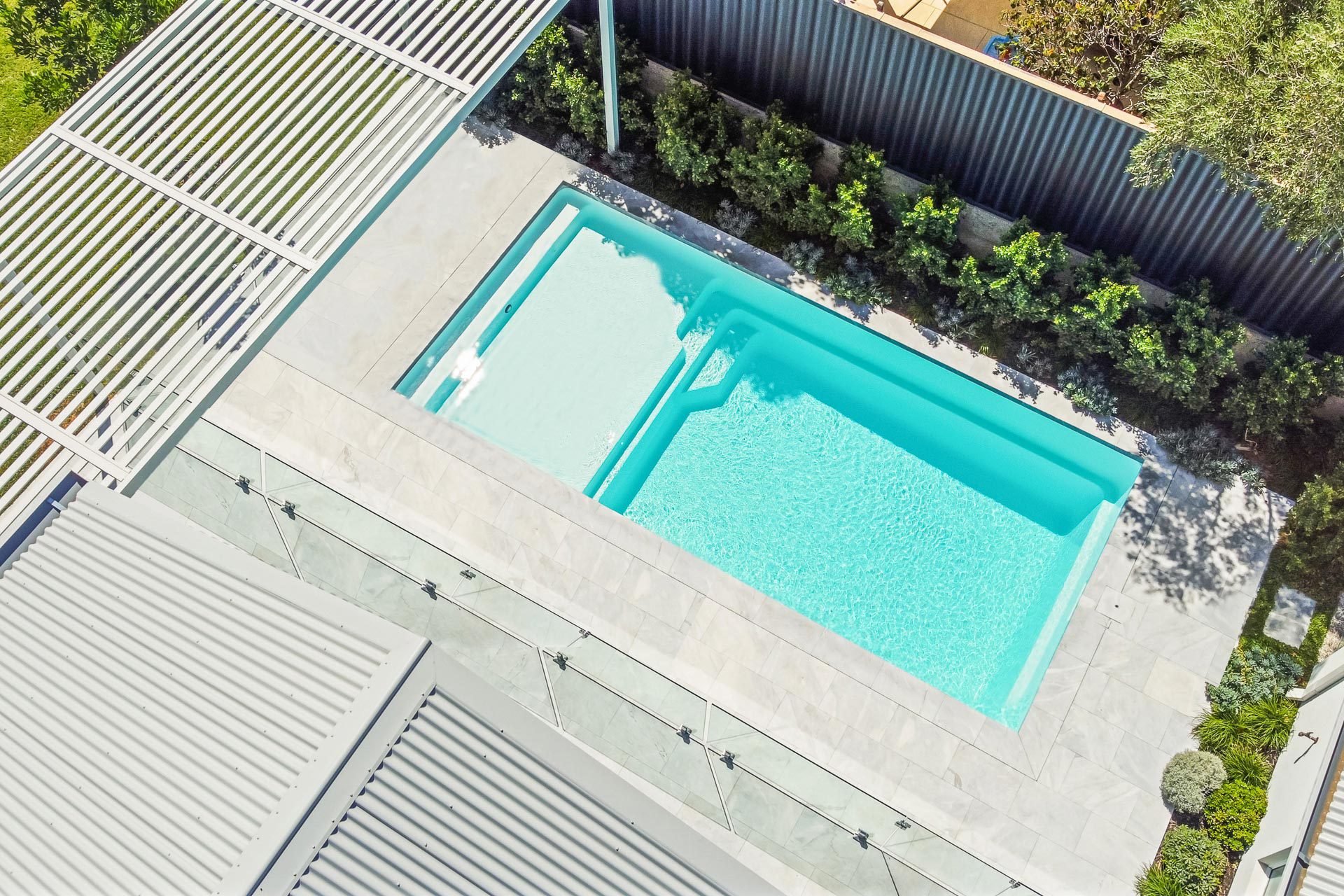 Our Sunseeker Slimline is a part of our ever growing range of fibreglass pools. This pool is featured in our Alpine White Shimmer colour, and is one of our newer installations. The sleek and aesthetically simple design leaves little to be wanted. The Sunseeker Slimline has a huge splash deck so the little ones can have a play – and you can bask under the sun, while still being in the cool water. Use this space as an entertaining area, base for a family staycation, or for pool parties! Regardless of how you use your fibreglass pool, it will last you many, many years.